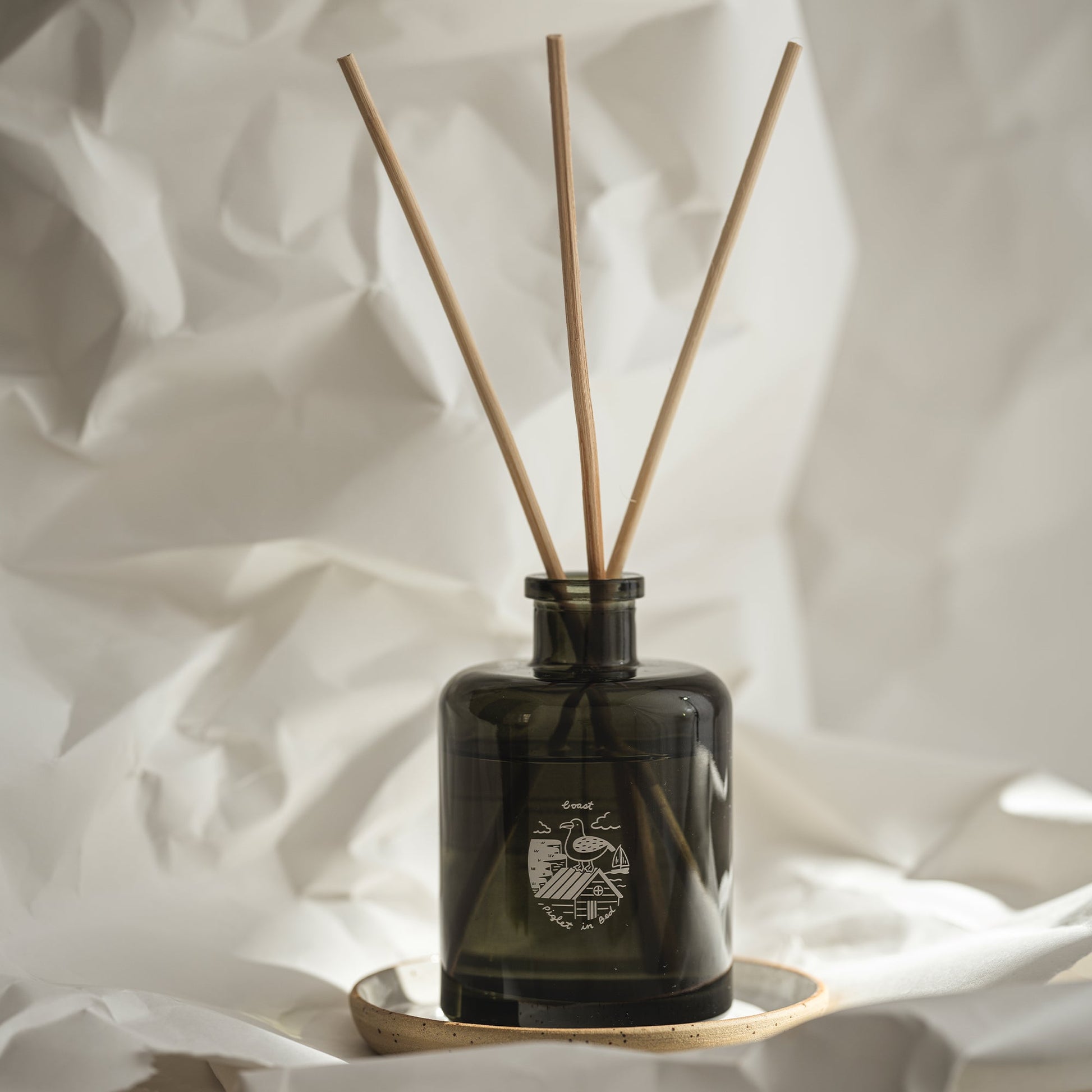 Our Coast diffuser combines notes of wood sage and samphire to create a fresh and earthy scent reminiscent of salty sea air on rugged coastal walks. With an elegant glass bottle design, our diffusers complement any interior style, gently infusing your home with beautiful fragrance. Each signature scent in this collection features a bespoke drawing by illustrator Jessie Wong, bringing to life four traditional scenes of the British countryside.