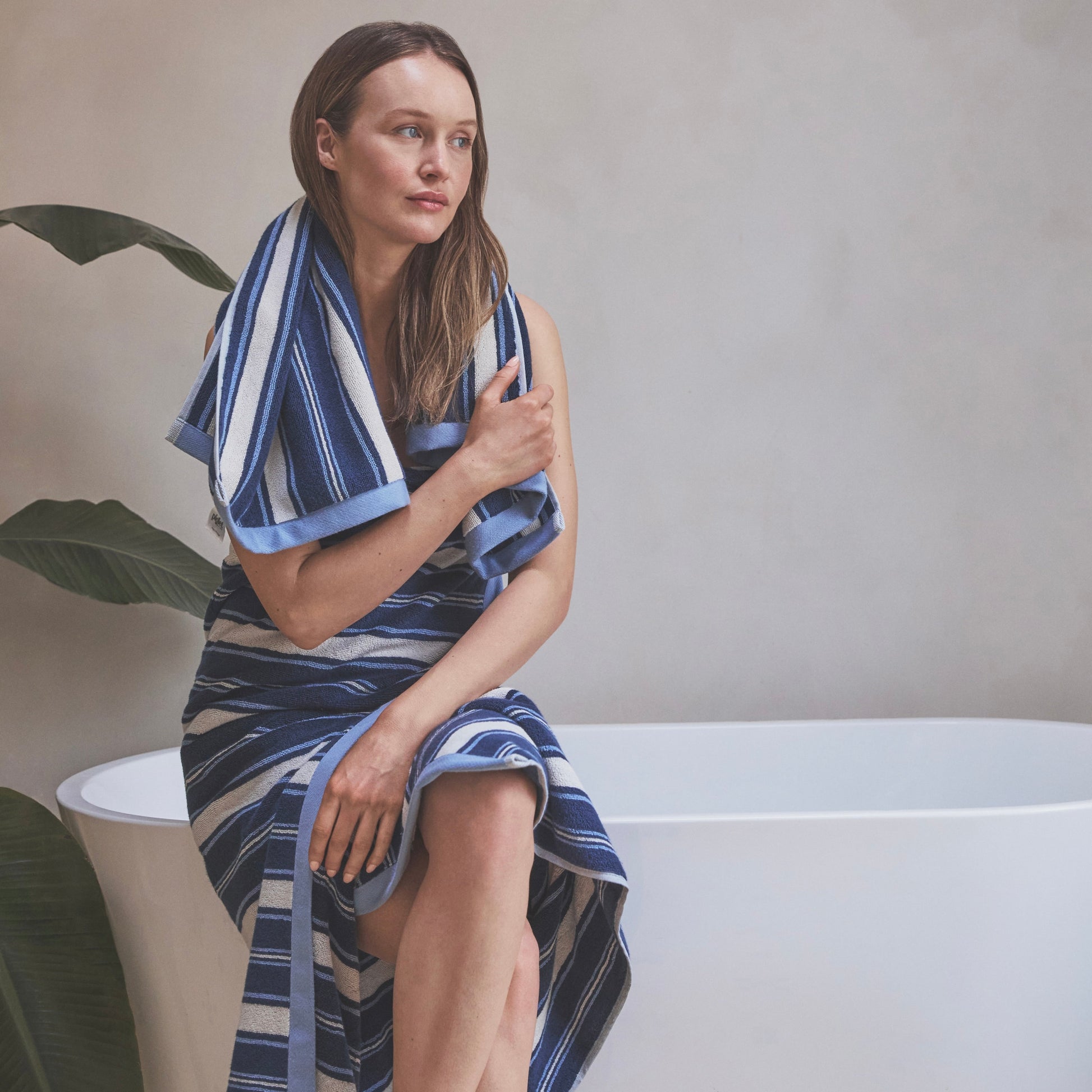 With a modern take on a classic heritage stripe, our Marina Blue Shoreham Stripe cotton towels are the perfect companion for the bathroom or the beach. Made from sustainably sourced zero-twist cotton, these striped towels have a soft and smooth feel, and are finished with a matching woven border.