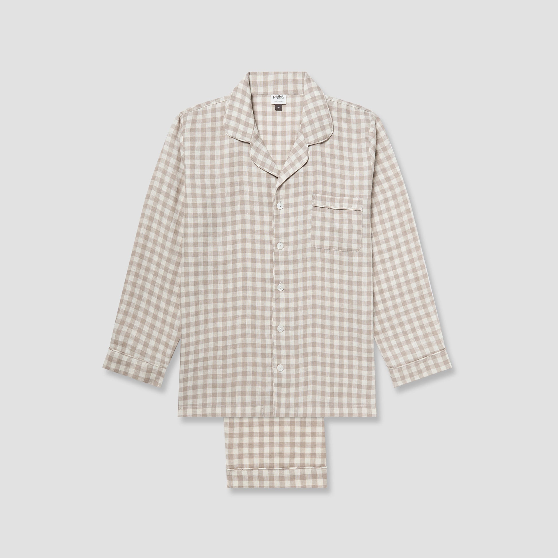 For a blissful night's kip, snuggle into nostalgic neutrals with our Mushroom Gingham Linen Pyjama Trouser Set, made from super soft 100% stonewashed linen. Made for slow weekend mornings and cosy nights in, our gingham linen sleepwear collection is completely natural and thermo-regulating, keeping you snug during winter and cool throughout the summer. The shirt and trouser shape is classic, and being made from lightweight natural linen makes this linen pyjama set effortlessly comfortable. Our gingham sleepwear is an oversized, and more relaxed fit than our core range; we recommend sizing down if a more snug fit is desired.