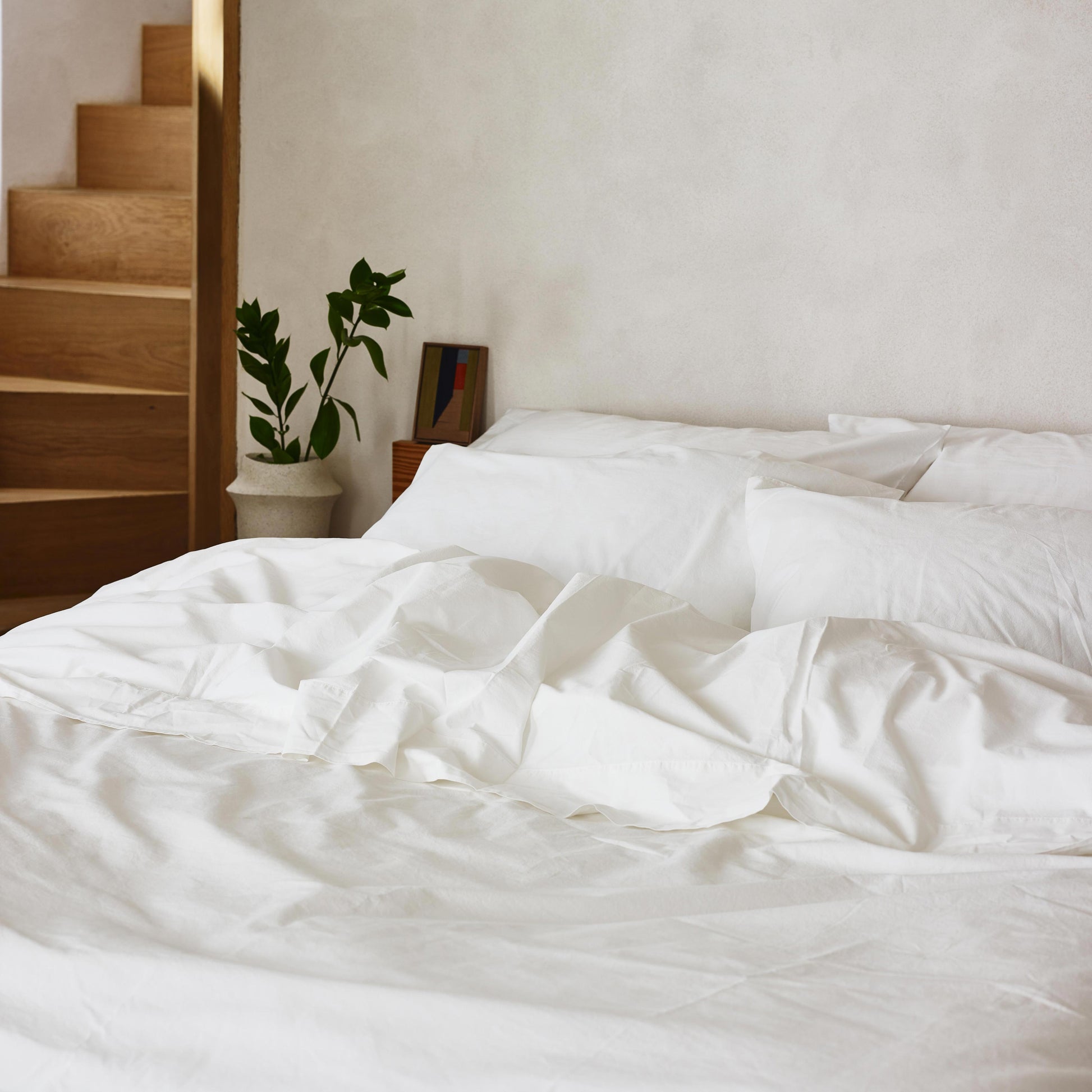 Our 100% cotton percale duvet covers are washed for extra softness, while the percale weave allows for a matte finish, high breathability and a relaxed look. Perfect for lovers of no-fuss, high quality cotton bedding. Our duvet covers feature handy ties on the inside corners to make sure that your duvet stays put inside the cover all night long. Pictured here in our classic and timeless White, which looks beautifully crisp on its own or can be teamed with any of the other shades in our cotton percale bedding range.